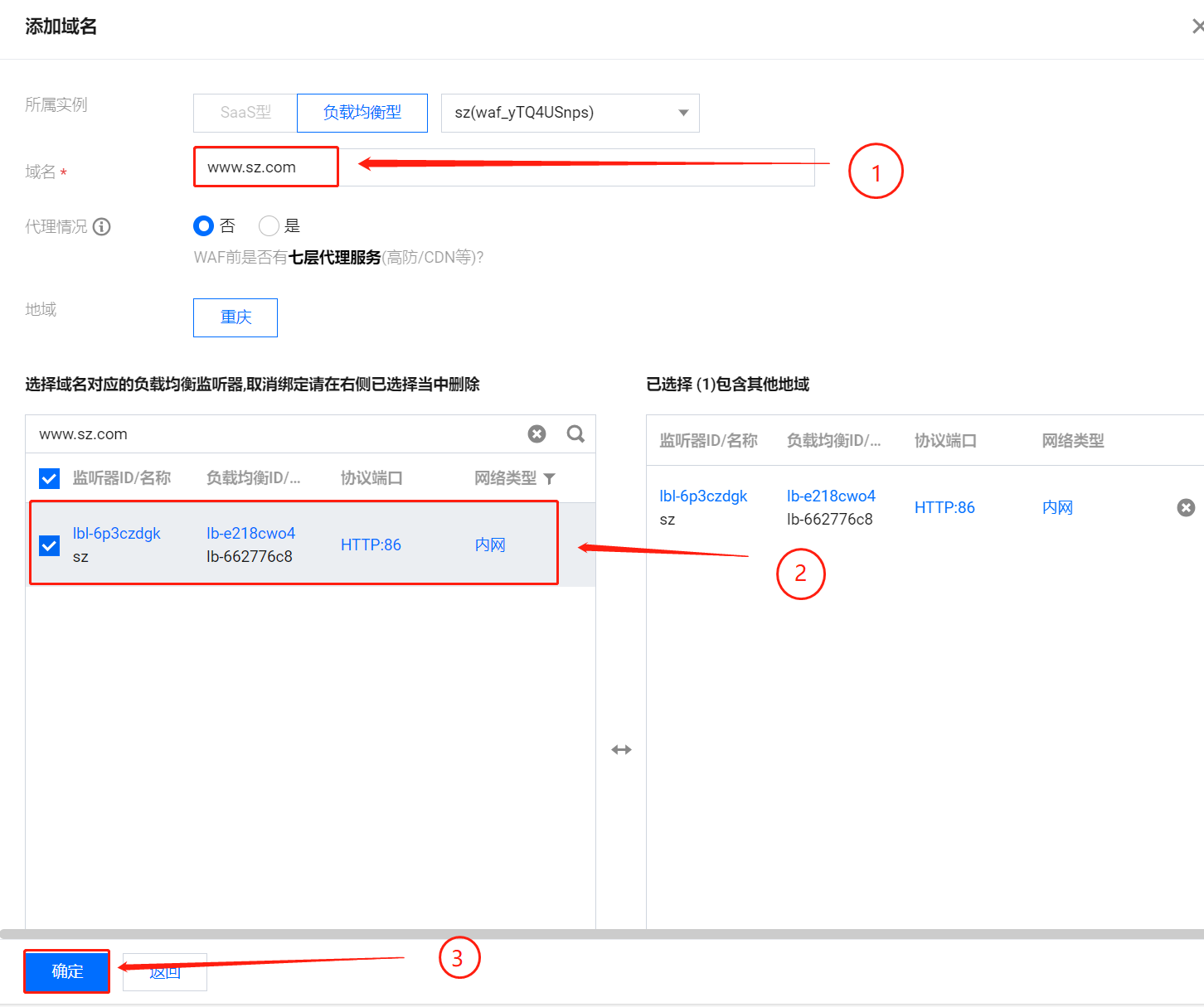 - 进入添加域名界面,先输入域名,勾选域名对应的负载均衡监听器,最后点击确定。