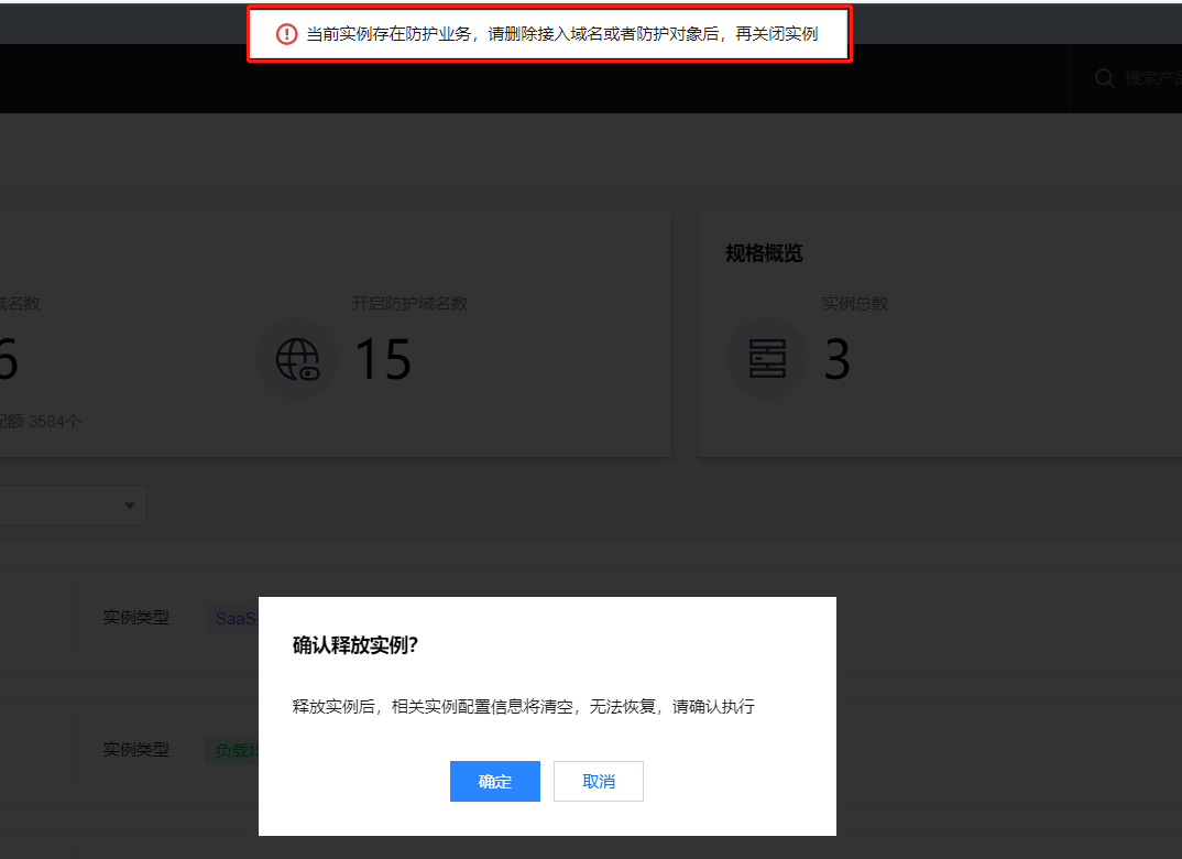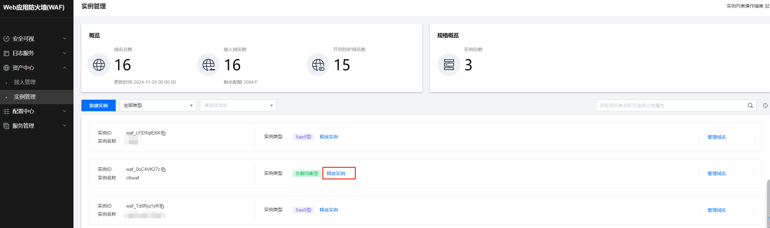 登录租户端WAF-资产中心-实例管理,找到对应实例,点击释放实例按钮,然后点击确定。