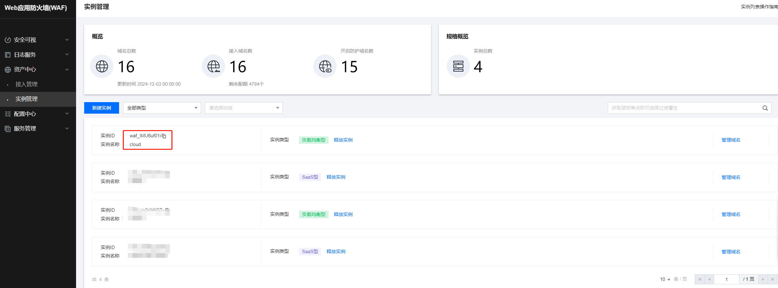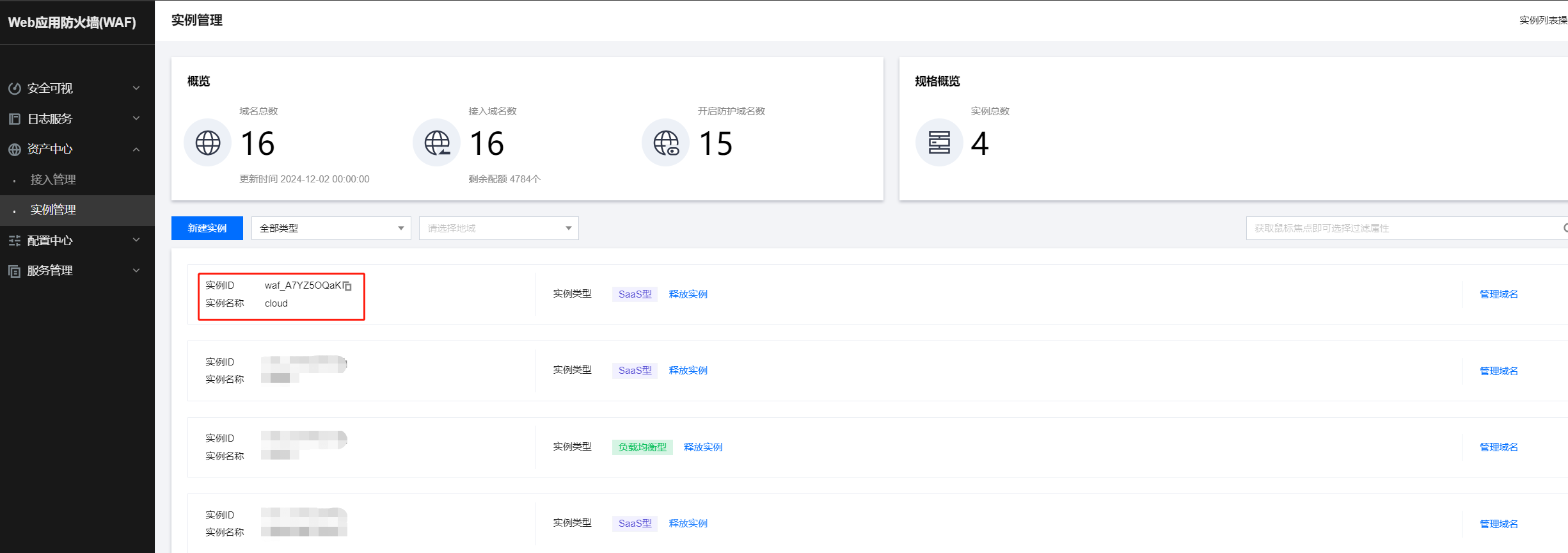实例是WAF计量的最小单位,支持创建多个实例;1个实例支持管理20个域名。以下操作以cloud为例,创建实例。