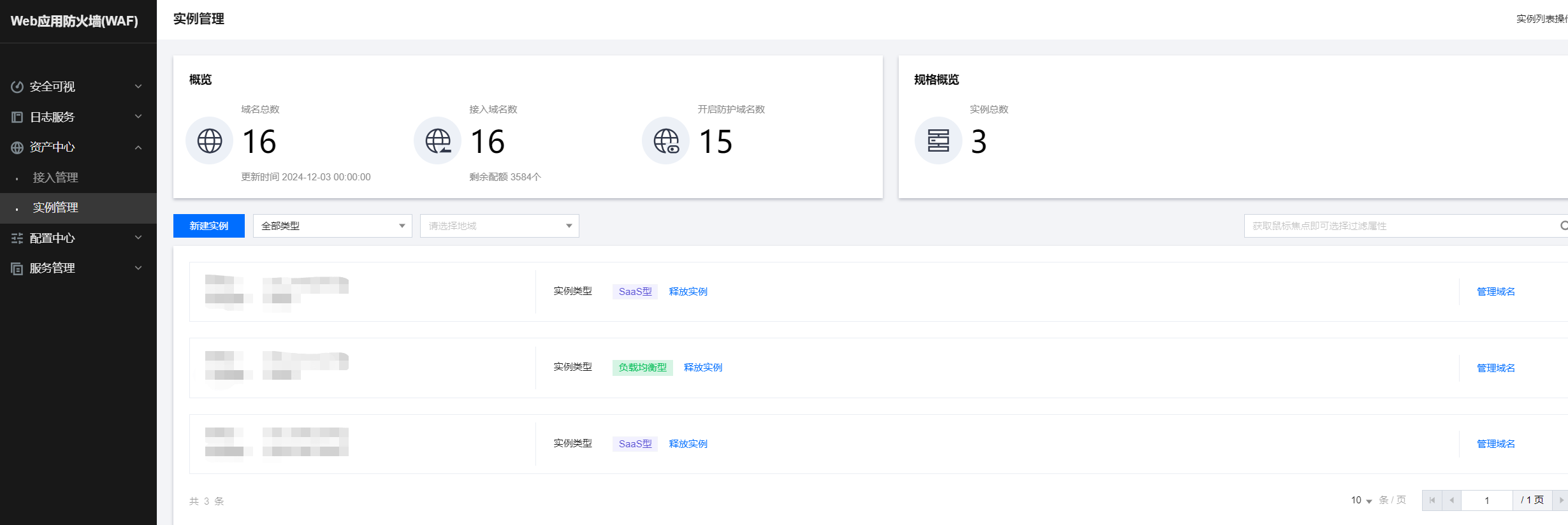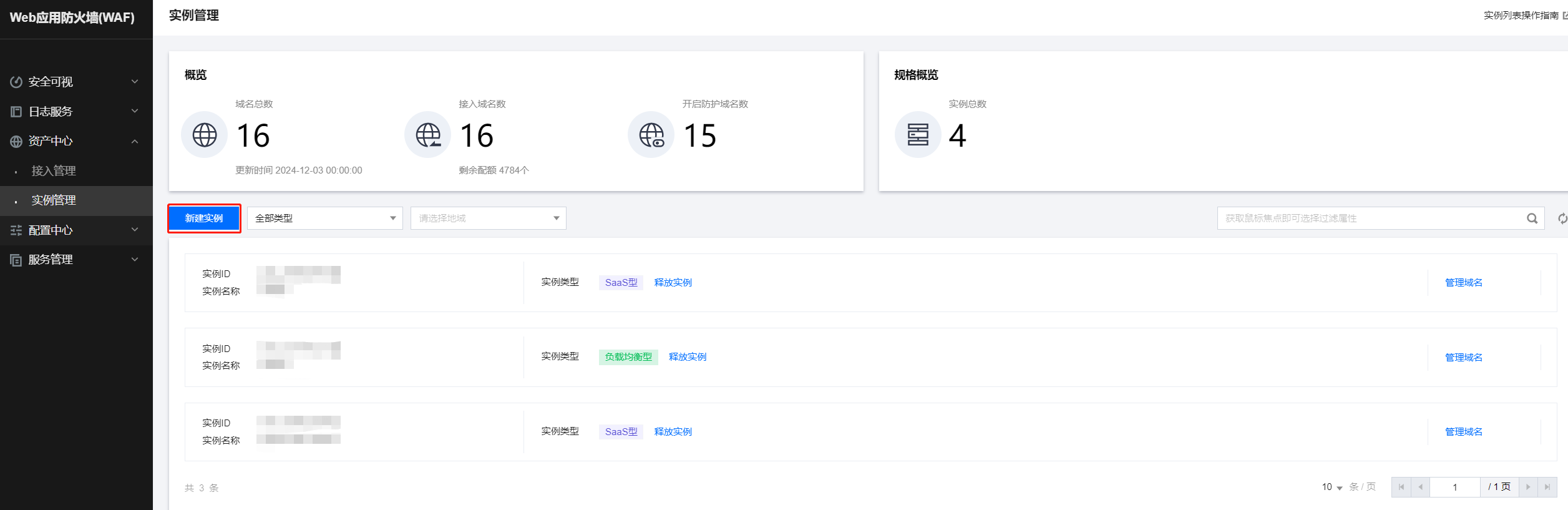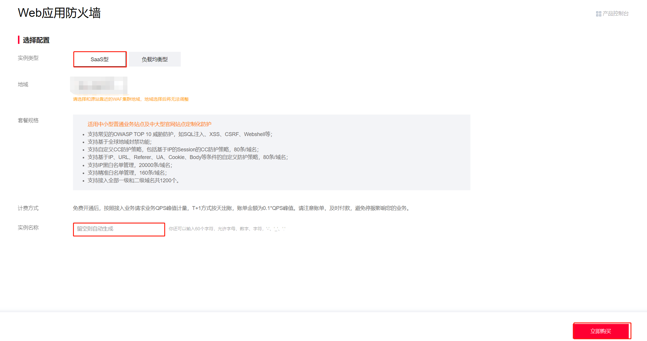 1.登录租户端WAF-资产中心-实例管理页面,点击新建实例;2.在购买页,实例类型选择“SaaS型”,实例名称填“cloud”,最后点击“立即购买”;