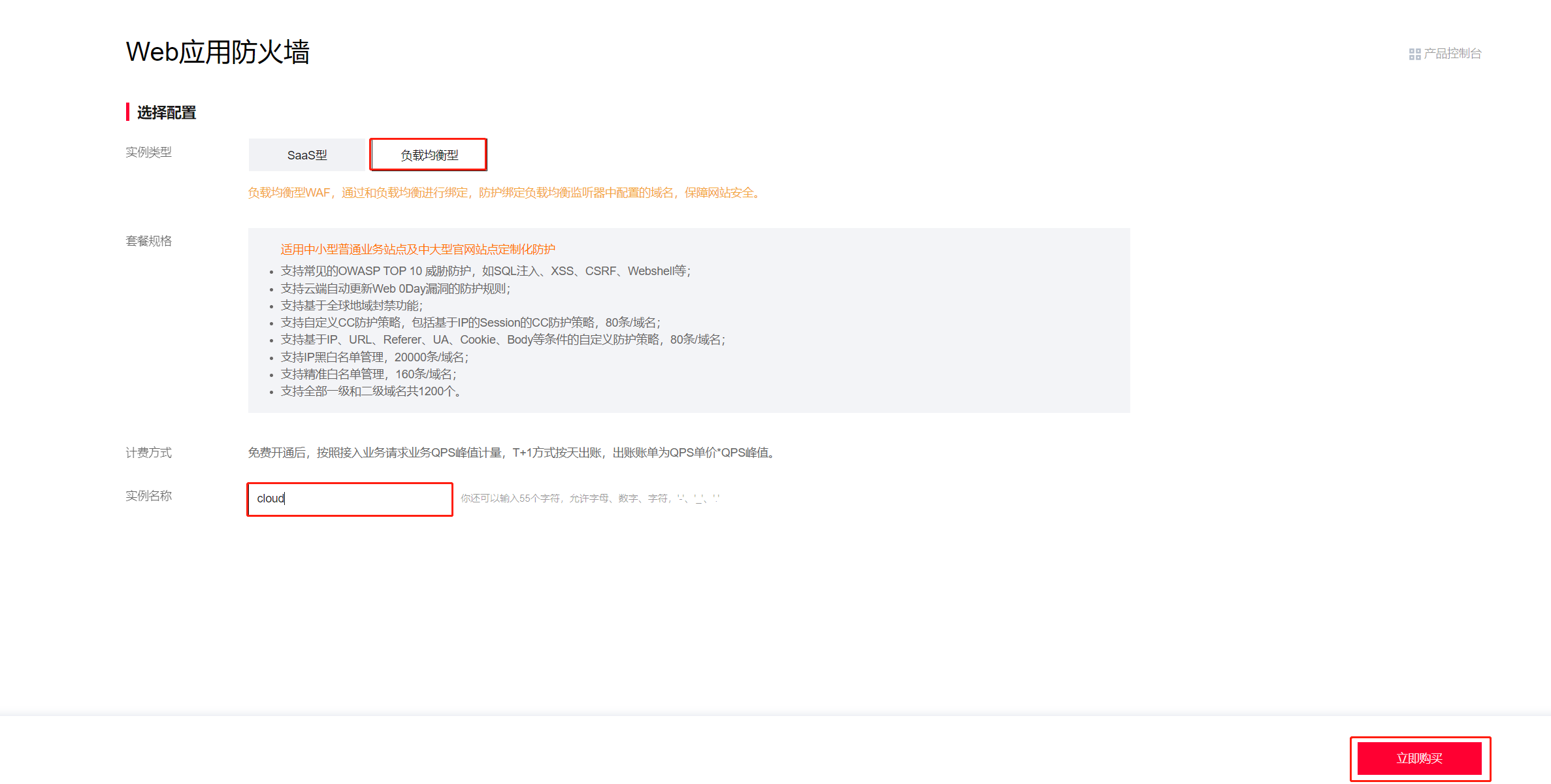1.登录租户端WAF-资产中心-实例管理页面,点击新建实例;2.在购买页,实例类型选择“负载均衡型实例”,实例名称填“cloud”,最后点击“立即购买”;