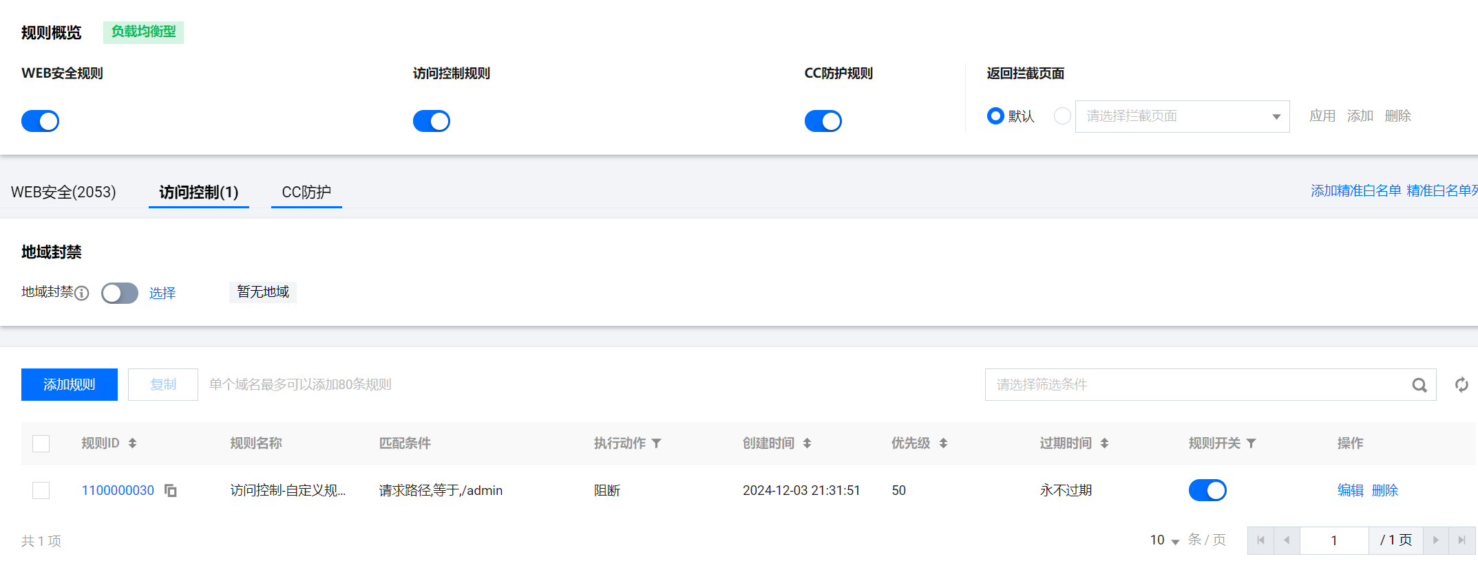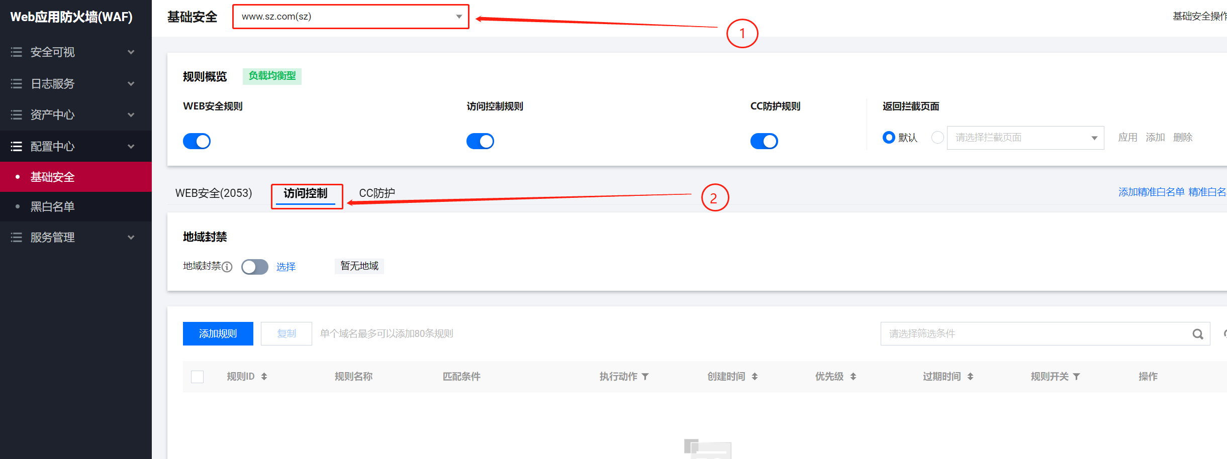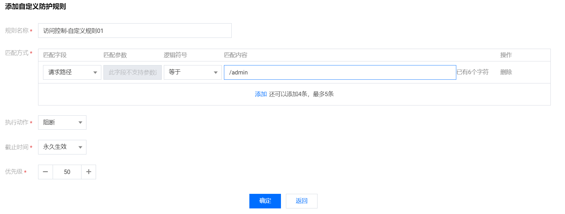 1.登录租户端WAF控制台-基础安全界面,选择需要的域名,点击“访问控制”。2.点击添加规则,添加一条自定义策略,匹配字段为‘请求路径’,逻辑符号选择‘包含’匹配内容为‘/admin’,执行阻断操作,最后点击确定。