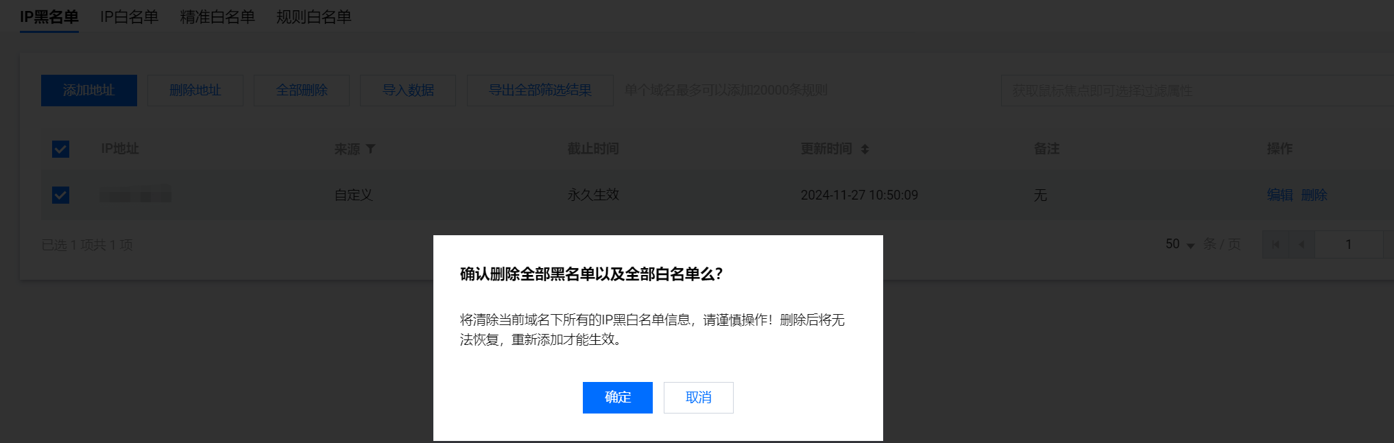 此操作将清除当前域名下所有的 IP 黑白名单信息,请谨慎操作!删除后将无法恢复,重新添加才能生效。