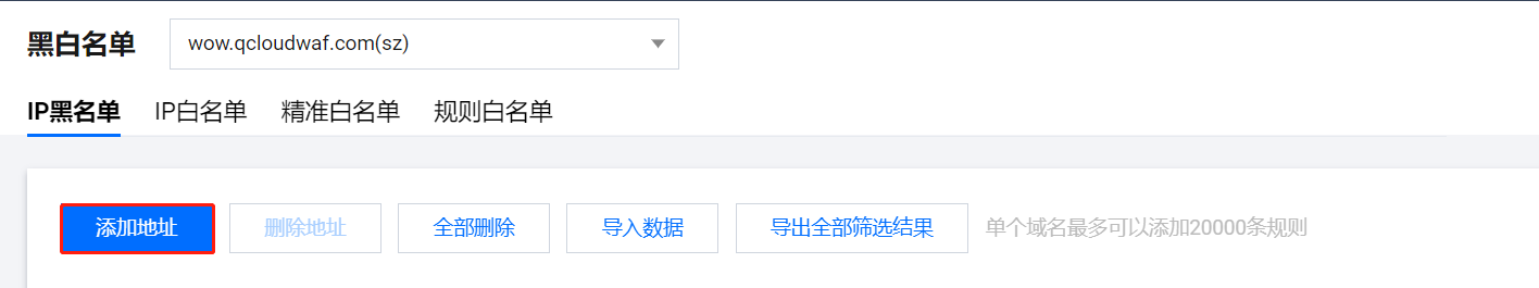 - 在 IP 黑名单页面,单击添加地址,进入添加黑名单页面。