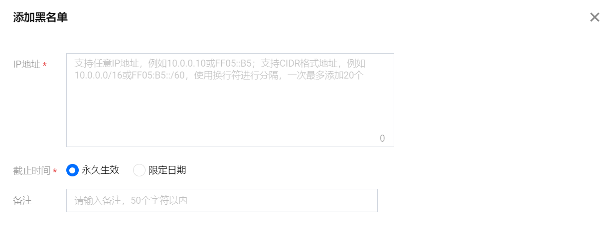 字段说明:**IP 地址:**支持任意 IP 地址或IP地址段,例如10.0.0.10或 FF05::B5;支持 CIDR 格式地址,例如10.0.0.0/16或 FF05:B5::/60,使用换行符进行分隔,一次最多添加20个。