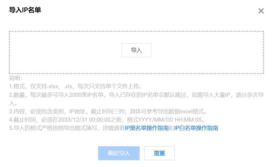 - 在 IP 黑名单页面,单击导入数据 > 导入,解析成功后,单击确认导入即可。