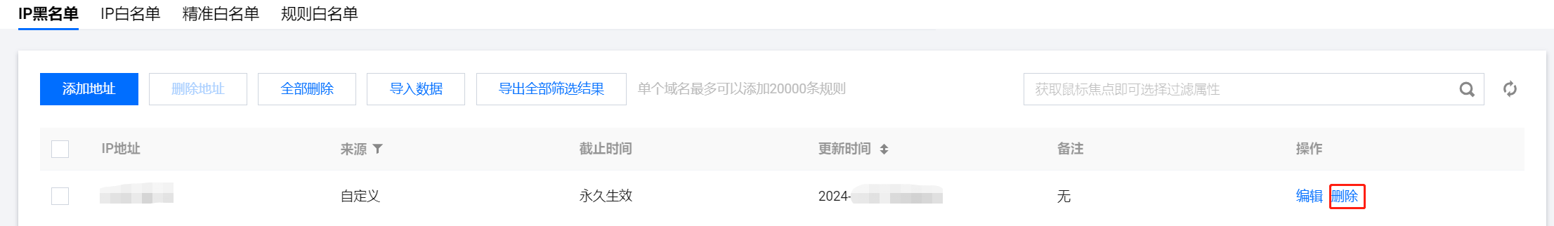 在 IP 黑名单页面,支持删除单个、部分、全部地址,具体操作如下: