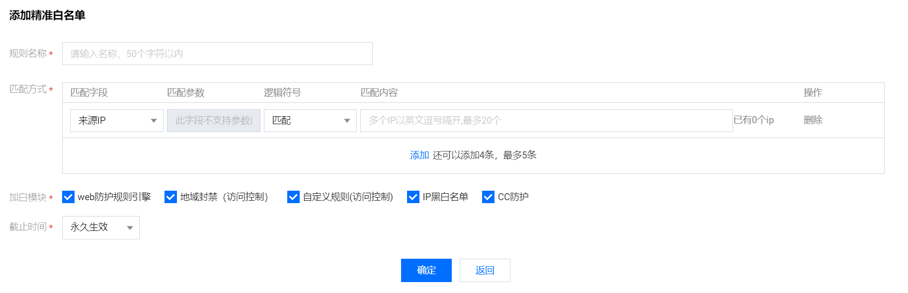 在添加精准白名单弹窗中,配置相关参数,单击确定。