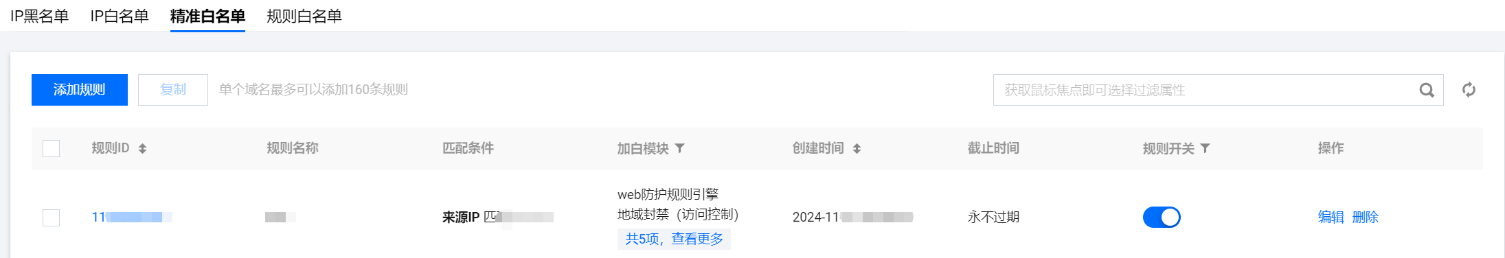 在精准白名单页面,单击添加规则,弹出添加精准白名单弹窗。
