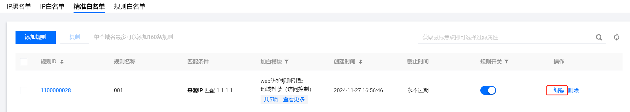- 在精准白名单页面,选择所需规则,单击编辑,弹出编辑精准白名单弹窗。