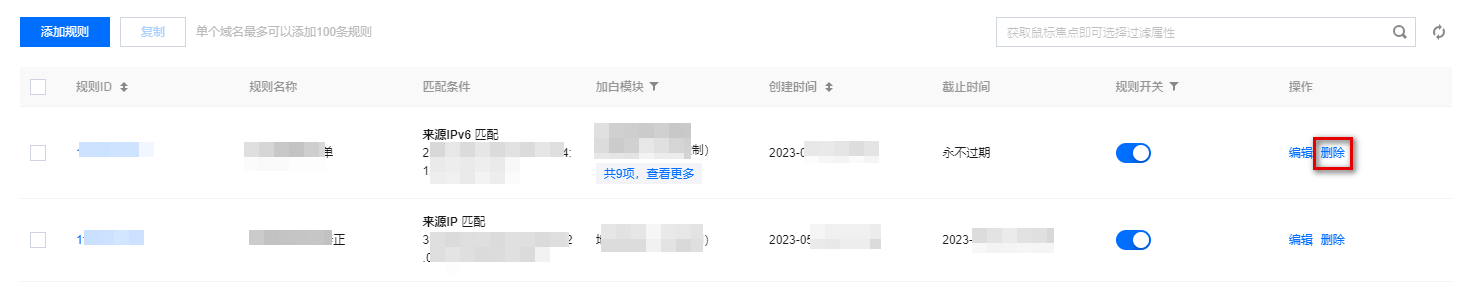 - 在确认删除弹窗中,单击确定,即可删除该规则。