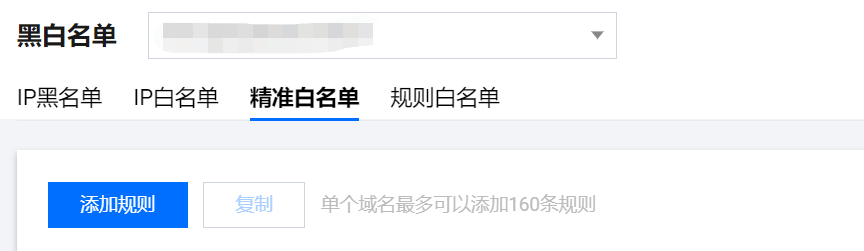- 在 黑白名单页面,左上角选择需要防护的域名,单击 精准白名单,进入精准白名单页面。