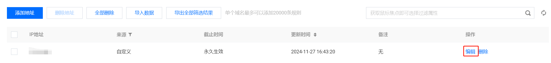 - 在 IP 白名单页面,选择所需 IP 地址,单击操作列的编辑,修改截止时间和备注,单击确定保存。