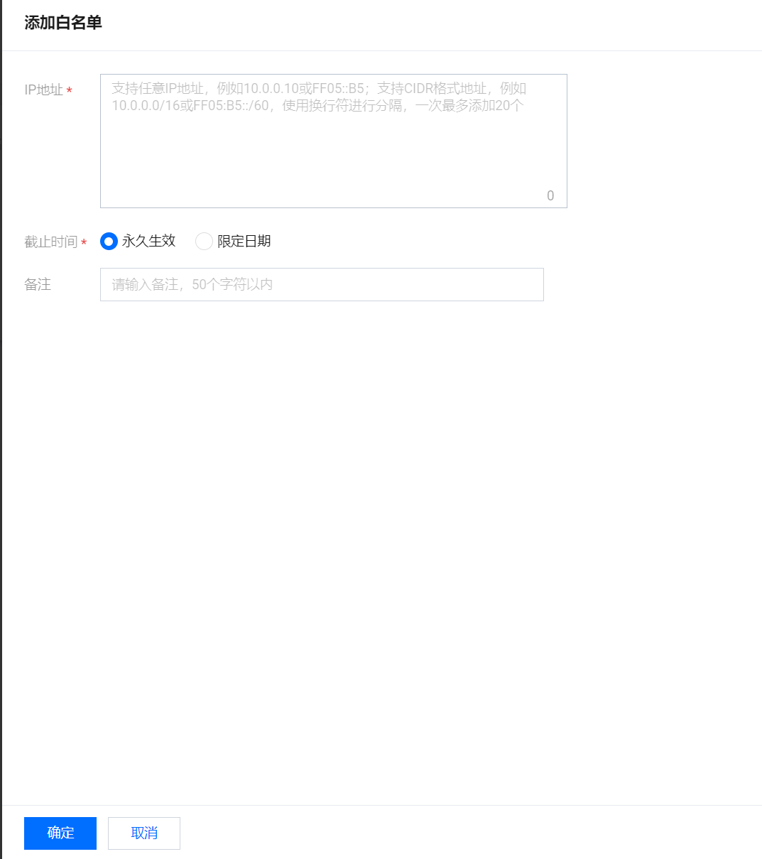 参数说明**IP 地址:**支持任意 IP 地址,例如10.0.0.10或 FF05::B5;支持 CIDR 格式地址,例如10.0.0.0/16或 FF05:B5::/60,使用换行符进行分隔,一次最多添加20个。
