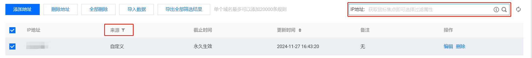 - 在 IP 白名单页面,单击搜索框通过 IP 地址对 IP 进行筛选,或单击来源根据来源分类对 IP 进行筛选。