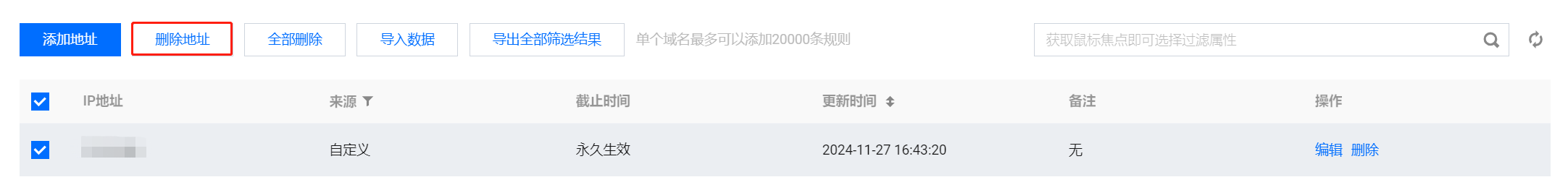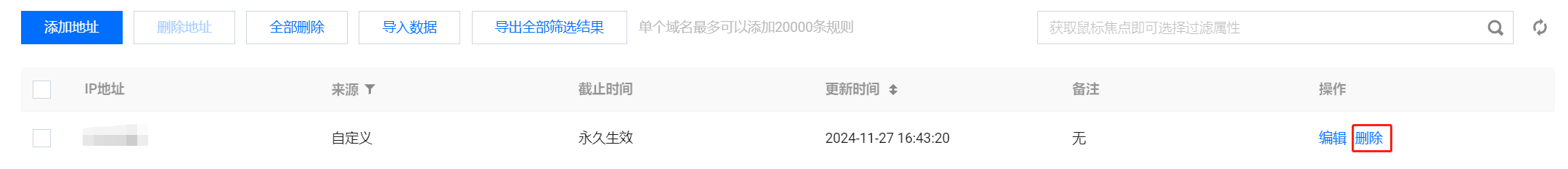 在 IP 白名单页面,支持删除单个、部分、全部地址,具体操作如下: