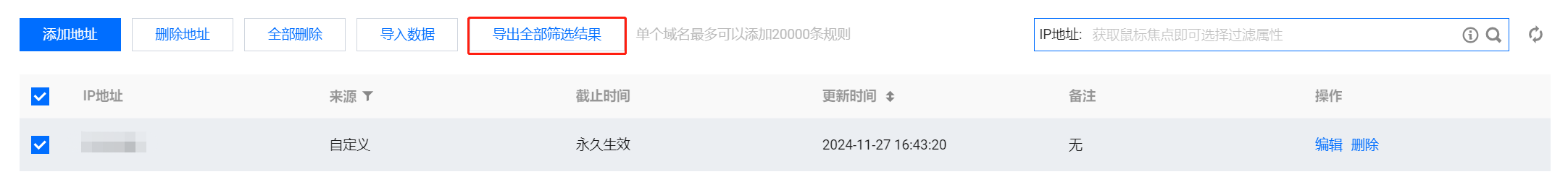 - 筛选完所需 IP 后,单击导出全部筛选结果,即可导出所需的 IP 筛选结果。