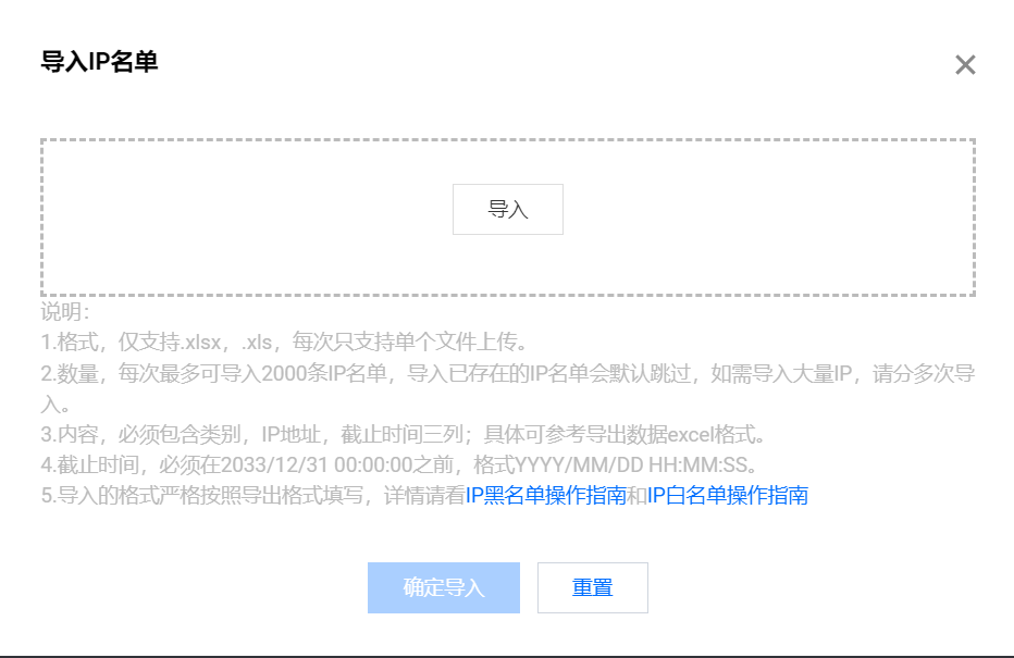 - 在 IP 白名单页面,单击导入数据 > 导入,解析成功后,单击确认导入即可。
