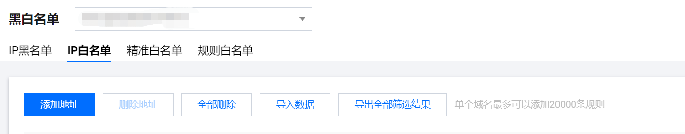 在 黑白名单页面,左上角选择需要防护的域名,单击 IP 白名单,进入 IP 白名单页面。