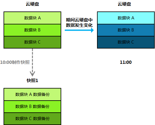 如下图所示,快照1保留的是10:00(制作快照时间点)云硬盘上数据块的信息,与后续时间发生的变化无关。