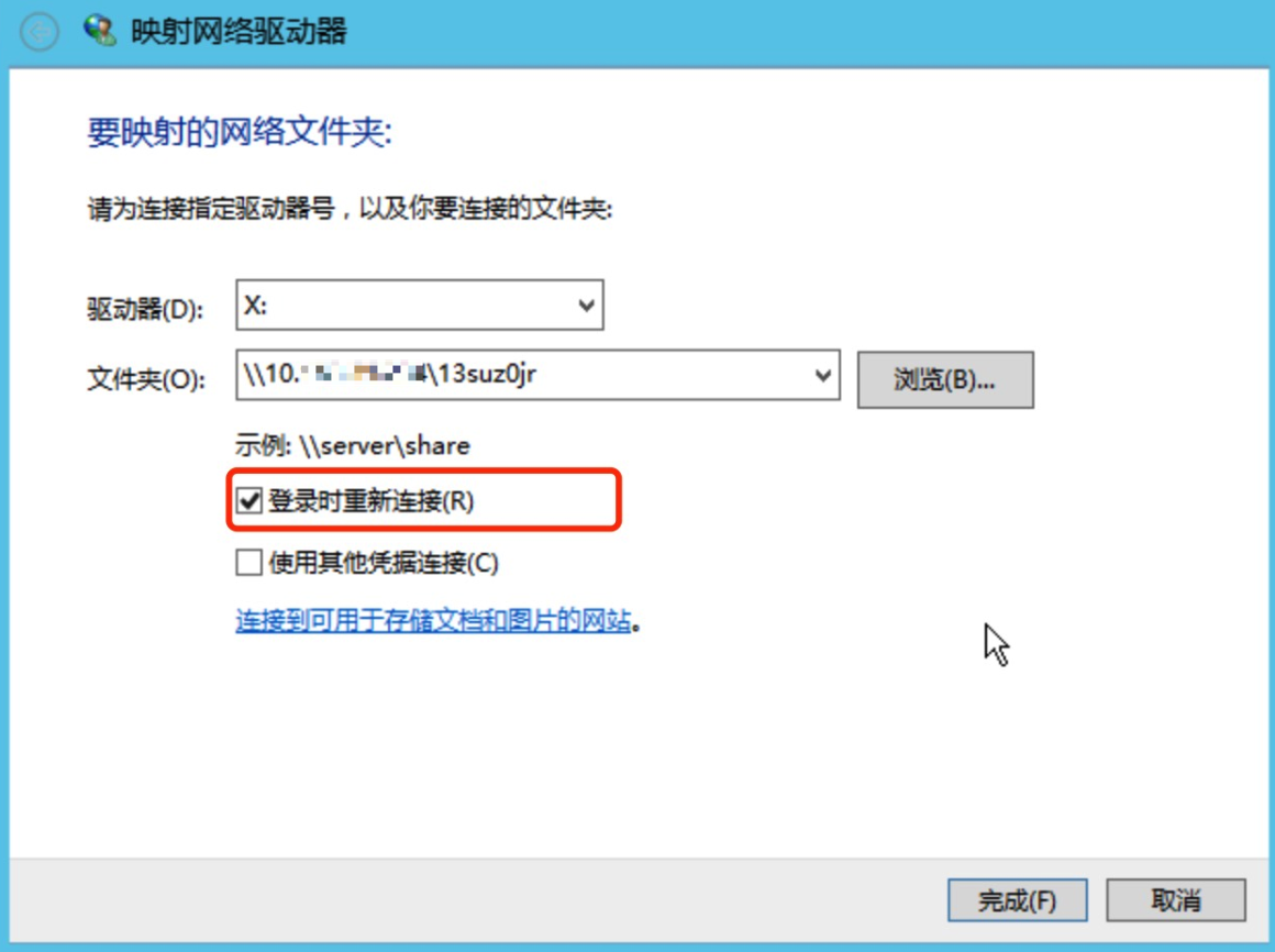 挂载时,勾选登录时重新连接选项,如下图示。更多挂载帮助请参见 在 Windows 客户端上使用 CFS 文件系统。