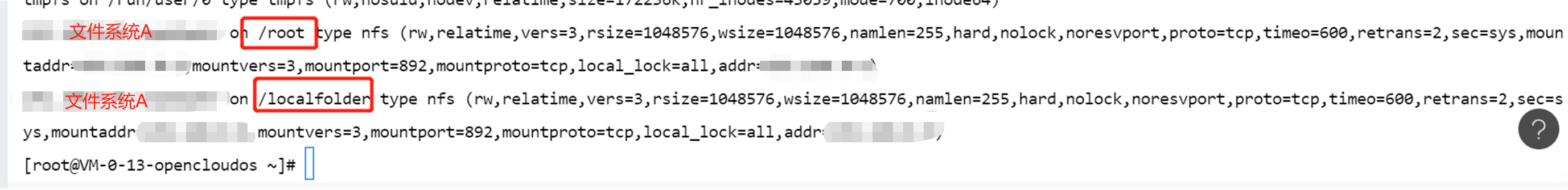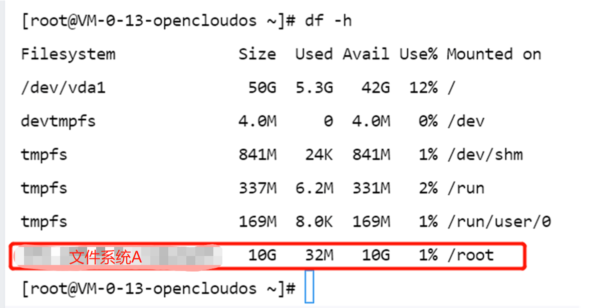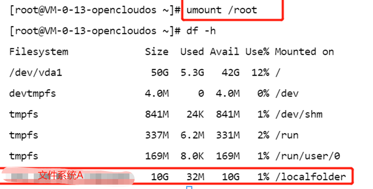 例如,文件系统 A 被同时挂载到 /root/ 和 /root/localfolder/ 下,使用 mount -l 能够查询到所有的挂载点信息,使用 df -h 只能查询到 /root/ 下的文件系统,卸载 root 目录下的文件系统后,再次执行 df -h,才能查询到 /root/localfolder/ 目录下的文件系统。