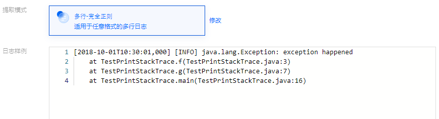 多行-完全正则模式适用于日志文本中一条完整的日志数据跨占多行(例如 Java 程序日志),且可按正则表达式提取为多个 key-value 键值的日志解析模式。若不需要提取 key-value,请参见 多行全文格式 进行配置。