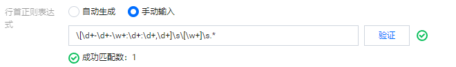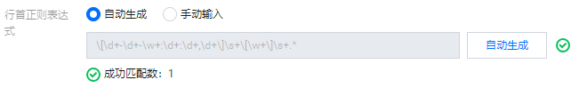 您可选择自动生成或者手动输入两种方式定义行首正则表达式,确定跨行日志边界。待表达式验证成功后,系统会为您判断行首正则表达式匹配的日志条数。- 自动生成:单击自动生成,系统自动在置灰的文本框中生成行首正则表达式。