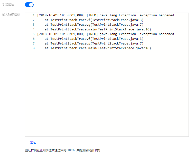 ,即可开启手动验证。 - 输入多个日志样例,单击验证。系统将验证样例正则表达式的通过率。