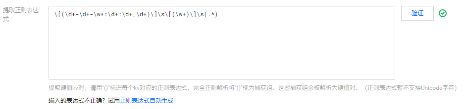 - 手动输入:在文本框中,手动输入行首正则表达式,单击验证,系统将判断表达式是否通过。