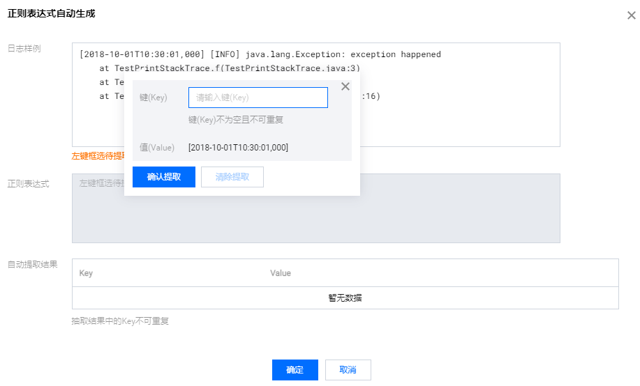 - 在弹出的“正则表达式自动生成”模态视图中,根据实际的检索分析需求,选中需要提取 key-value 的日志内容,并在弹出的文本框中,输入键(key)名,单击确认提取。