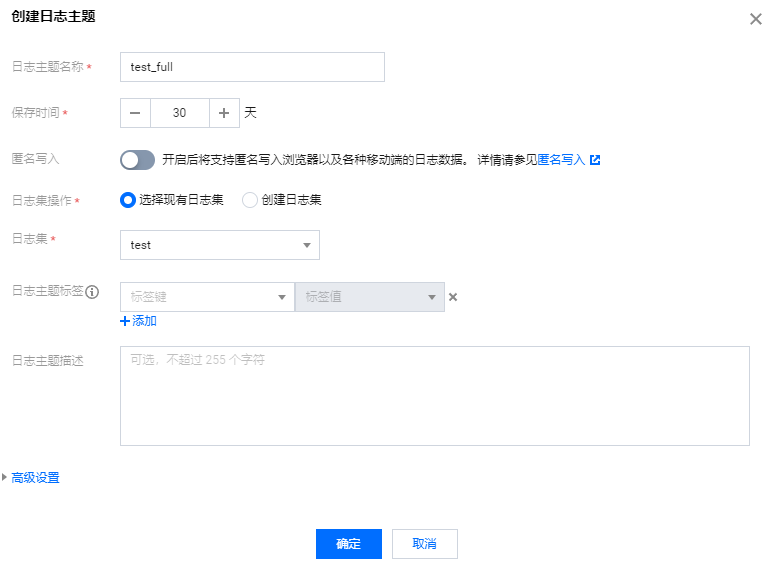 - 在弹出的对话框中,将“日志主题名称”填写为“test_full”,单击确定,即可新增日志主题。