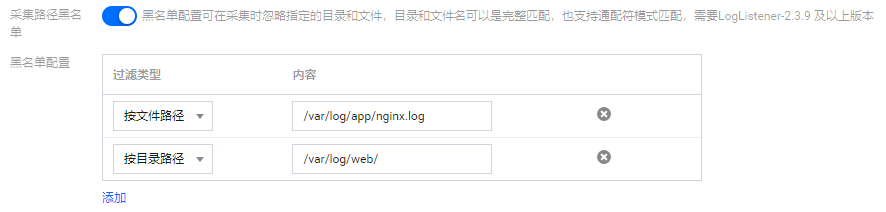 开启采集路径黑名单,可在采集时忽略指定的目录前缀或完整的文件路径。目录路径和文件路径可以是完全匹配,也支持通配符模式匹配。