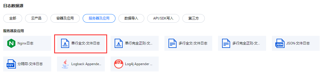 - 选择采集配置页签,在 LogListener 采集配置中单击新增,并在服务器及应用栏中选择单行全文 - 文件日志。