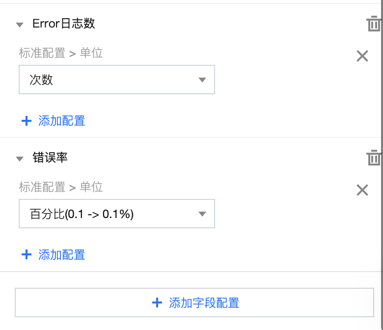 示例:当表格有多个指标时,如想把 Error 日志数、错误率同时显示在同一行,并带上单位。Error 日志数单位为 “次数”,错误率单位为 “%”,单位不同。此时选择添加字段配置,选择“Error 日志数”,单位配置为“次数”,选择“错误率”,单位配置为“%”,实现不同的字段配置不同的效果。