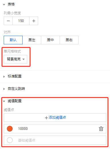 | 阈值配置 | 设置阈值点,配合单元格样式配置,可以使符合阈值的行或列高亮显示。 |
