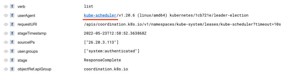 {{}}包裹字段名称作为变量,表示该字段的完整值,例如上图中可使用{{userAgent}}代表字段 userAgent 的值,{{userAgent}}=kube-scheduler/v1.20.6 (linux/amd64) kubernetes/1cb721e/leader-election。