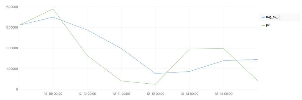 选择查询和分析的时间范围为最近7天,并执行如下查询和分析语句,其中 pv 为每天的应用吞吐量,avg_pv_3 是3天移动平均后的应用吞吐量。