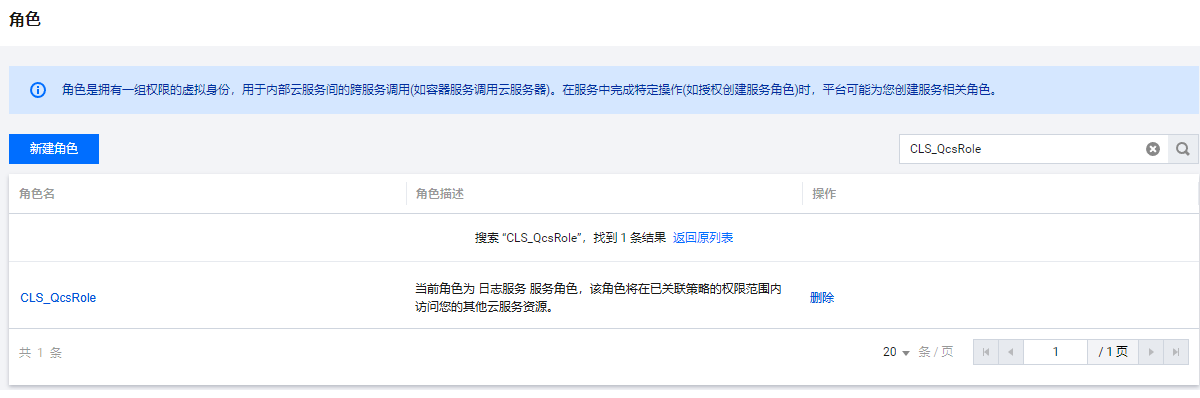 3. 角色管理页面中,查看是否存在 CLS_QcsRole 角色。可通过列表右上角的搜索框进行搜索。