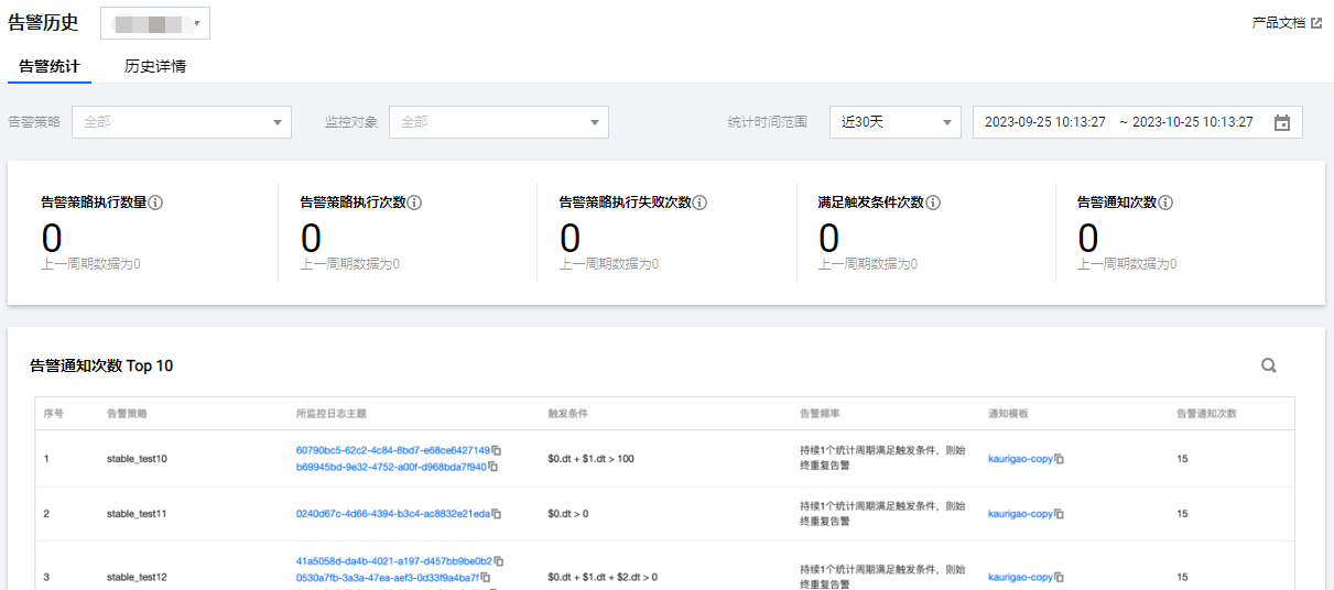 | 告警通知次数 Top 10 | 统计时间范围内,触发通知发送次数最多的10个告警策略 |
