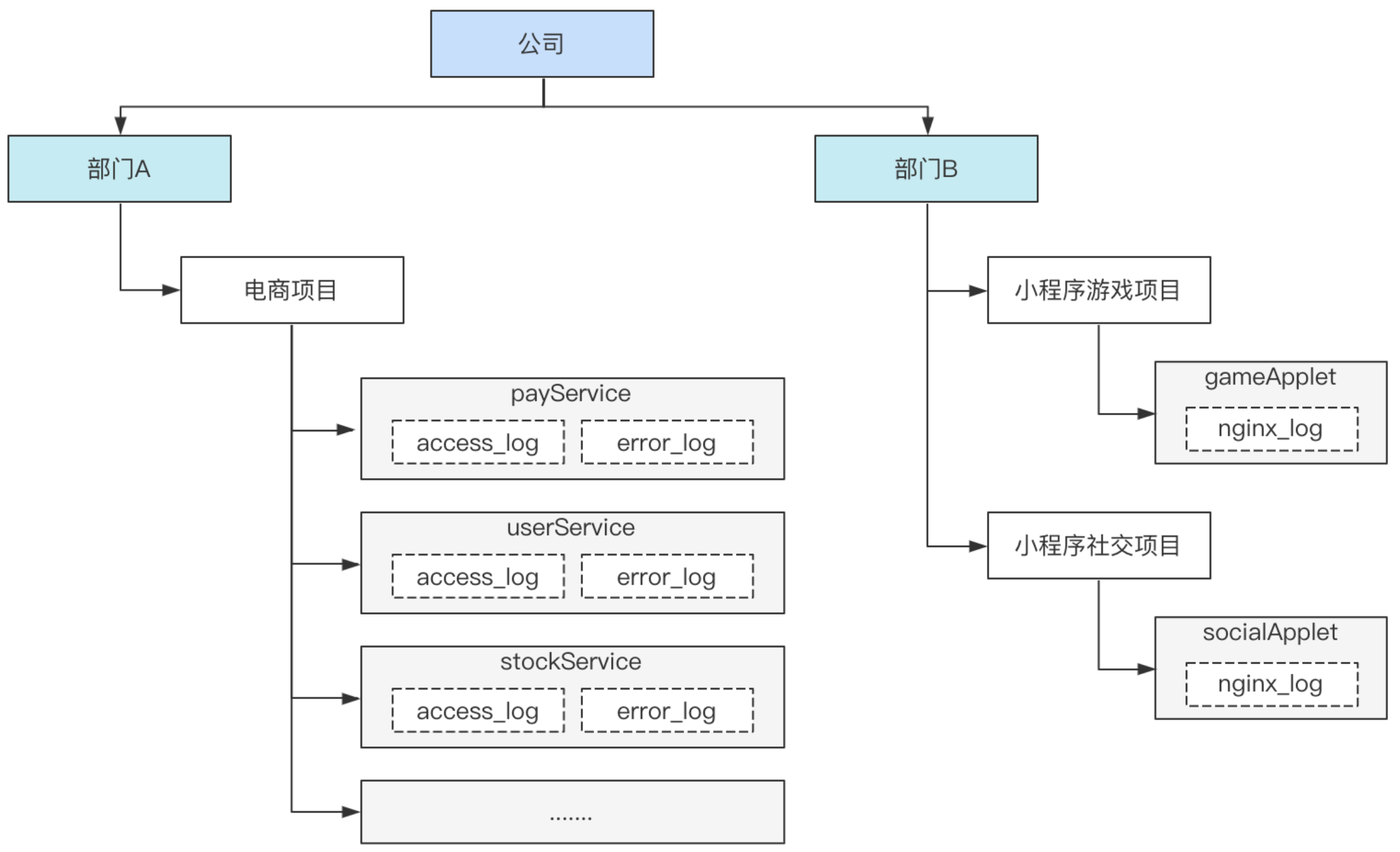 - 部门 A 有一个电商项目,采用微服务架构,每个服务均包含访问日志(access_log)和错误日志(error_log)两类日志。