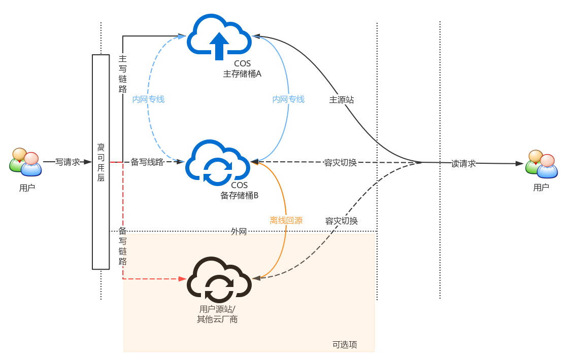 - 客户还可以选择在自有源站或者其他云厂商上先备份一份冗余数据,同时给存储桶 B 配置回源策略。假设在极端情况下,主存储桶 A 和 B 链路都同时无法连通,那么在上传数据到存储桶 B 失败的情况下,存储桶 B 可以从源站拉取数据。