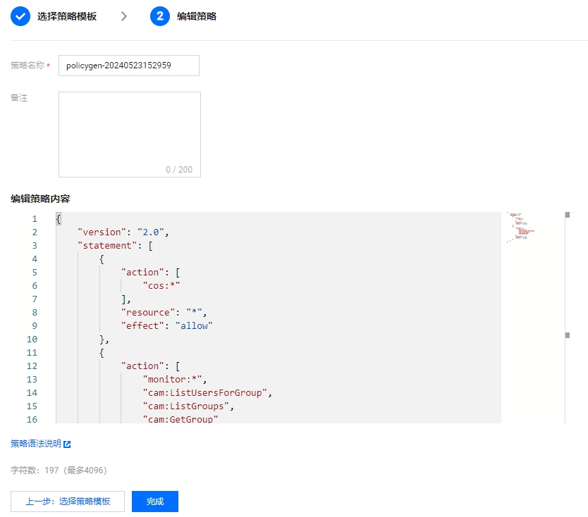 - 输入便于您记忆的策略名称,若您选择空白模板,则需要输入您的策略语法,详情请参见策略示例。您可将策略内容复制粘贴到编辑策略内容输入框内,单击完成。
