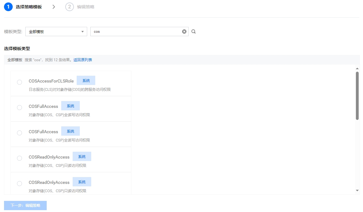 - 可供选择的模版有空白模板和与 COS 相关联的预设策略模板,选择您需要授予子账号的策略模板,单击下一步:编辑策略。