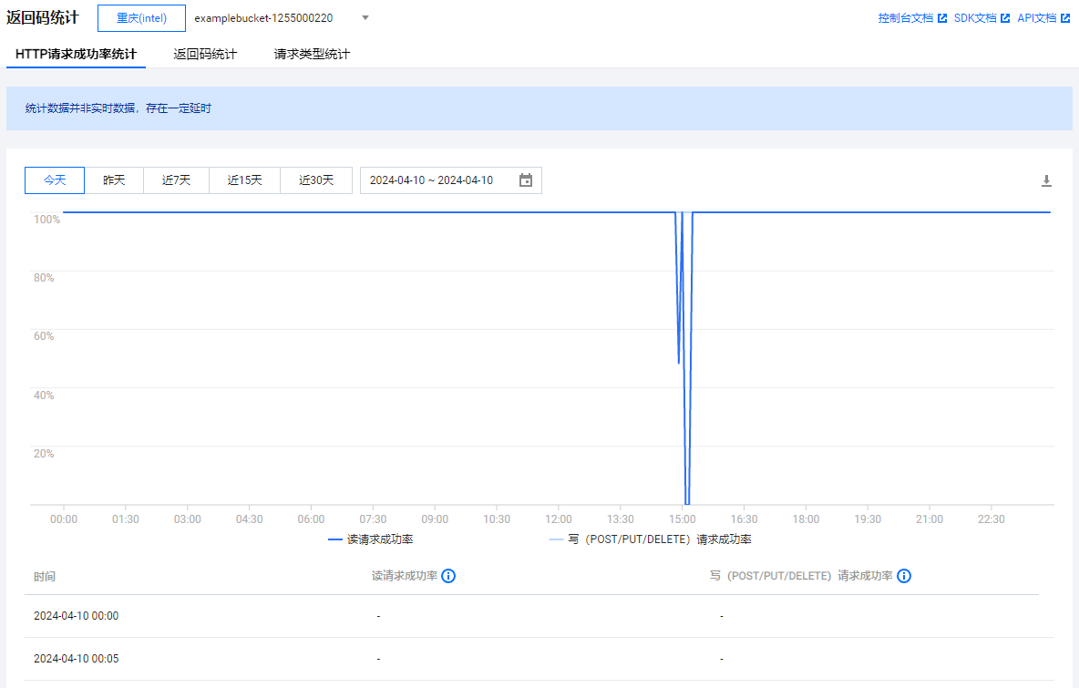- 返回码统计页面以对应时间段趋势图和列表的形式,可切换项目和存储桶,查看当天、昨天、近 7 天、近 15 天、近 30 天的数据: