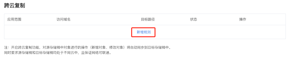 - 选择容错容灾管理 > 存储桶复制,在跨云复制配置中,单击新增规则,进入跨云复制规则配置状态。