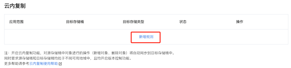- 选择容错容灾管理 > 存储桶复制,在云内复制配置中,单击新增规则,进入云内复制规则配置状态。