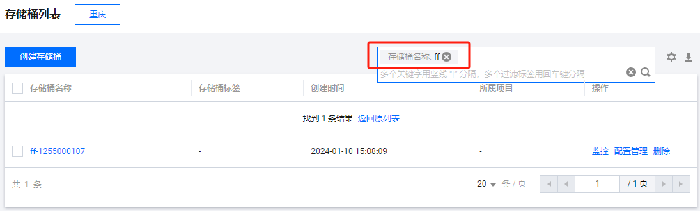 - 按照存储桶名称查询:可输入存储桶的名称进行查询,支持存储桶名称的前缀匹配查询。