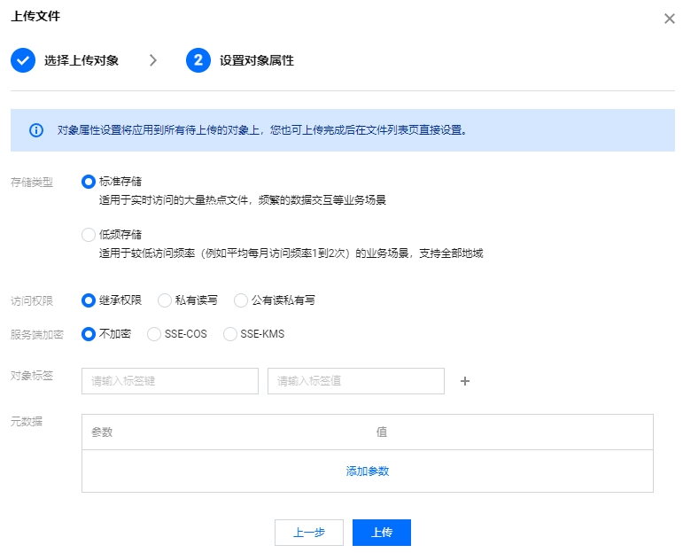 设置待上传文件的访问权限、元数据,单击上传。配置说明如下: