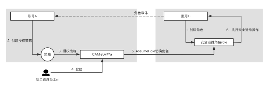 假设企业内有账号 A 和账号 B 两个主账号,企业安全管理员工 m 在账号 A 下有 CAM 子用户 a,员工 m 希望使用该子账号能够同时运维管理账号 B 下的安全信息。这时我们可以按照以下步骤执行操作: 1、在账号 B 下创建安全运维角色 role,并将角色载体指定为主账号 A。 2、在账号 A 下创建权限策略,策略定义了安全运维所需要的一下操作,并将策略关联给角色安全运维角色 role。 3、A的管理员登录平台,在访问管理的角色列表里,授权允许m扮演角色role。 4、员工 m 登录 CAM 子用户 a。 5、员工 m 在控制台选择切换角色,使用安全角色 role 登录控制台。 6、执行安全运维相关操作。 7、如果员工 m 需要同时对多个主账号执行安全运维的相关操作,则可以参照上述步骤为员工 m 授予对应主账号的安全运维权限。